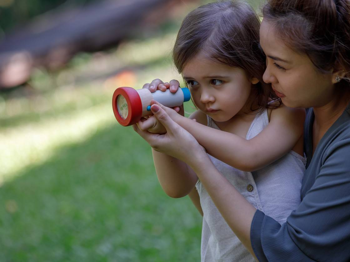 View the world through an artistic lens with the wooden Kaleidoscope! Little ones can put their favorite objects inside and experience a swirling explosion of brilliant colors.